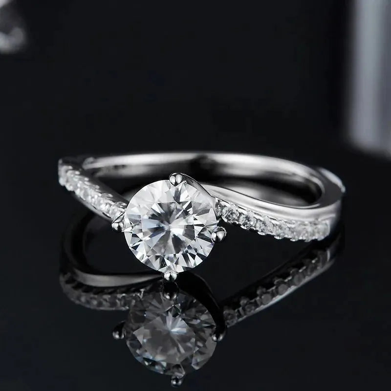 The Elantria Moissanite Twist Ring is a graceful and modern design that highlights the beauty of simplicity. At its center, a radiant 1.0CT round-cut Moissanite sparkles brilliantly, secured in a classic six-prong setting.
